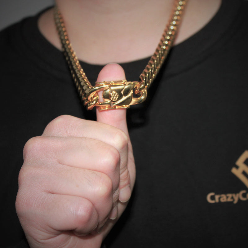 Timeless, iconic and trendy, this chunky link Cuban chain necklace comes embellished with a bedazzled buckle charm and dressed up with a lustrous high shine gold finish.Waterproof, Good with Shower or Beach.